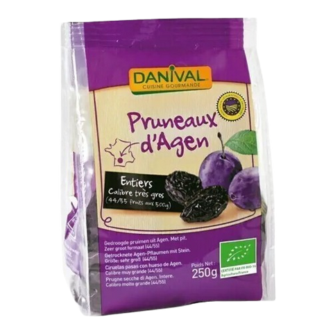 Discover the Organic Agen Prunes large caliber 44/55, 500g from Danival.