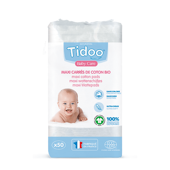 Pour plus de pureté et de douceur, les maxi carrés de coton ultra doux Tidoo sont composés à 100% de coton biologique non OGM, cultivé sans pesticide chimique de synthèse et blanchi à l’eau oxygénée pour plus de pureté et de douceur. Ils ne contiennent pas de chlore.