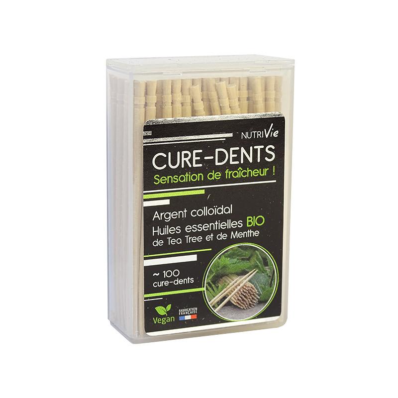 Cure-dents en bois de bouleau, argent colloïdal, huiles essentielles Bio de Tea tree et de menthe des champs, menthol d'origine naturelle.